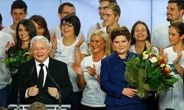 Poland lurches to right with election of Law and Justice party Jarosław Kaczyński (front left), leader of Poland's winning party, Law and Justice (PiS), and its candidate for prime minister, Beata Szydło (front right), ...